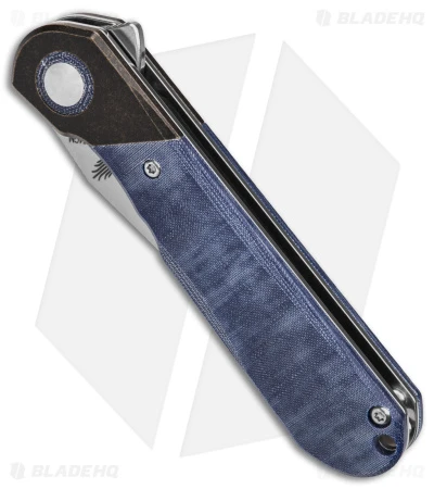 - Blue denim micarta handle scales with dark brass bolsters.