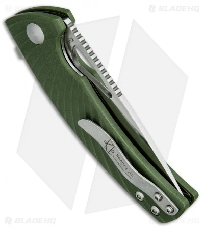 This Kizer Kyre is the Vanguard version of TK Knives popular custom knife model. Kizer has modified the design nicely, using quality materials that are both durable and affordable. The handle consists of contoured black G-10 scales over steel liners. This gives the knife a collectible appearance while providing a smooth, comfortable grip. The Kizer Vanguard Series allows you to experience a custom design at an incredible value. This version of the Kyre features a green G-10 handle and a drop point blade in a satin finish.